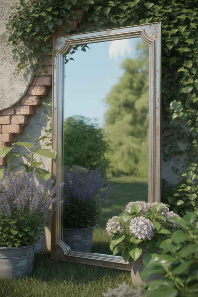 A decorative garden mirror makes small outdoor spaces look larger. Place it against a fence or wall surrounded by plants. The reflection creates depth and visual interest.